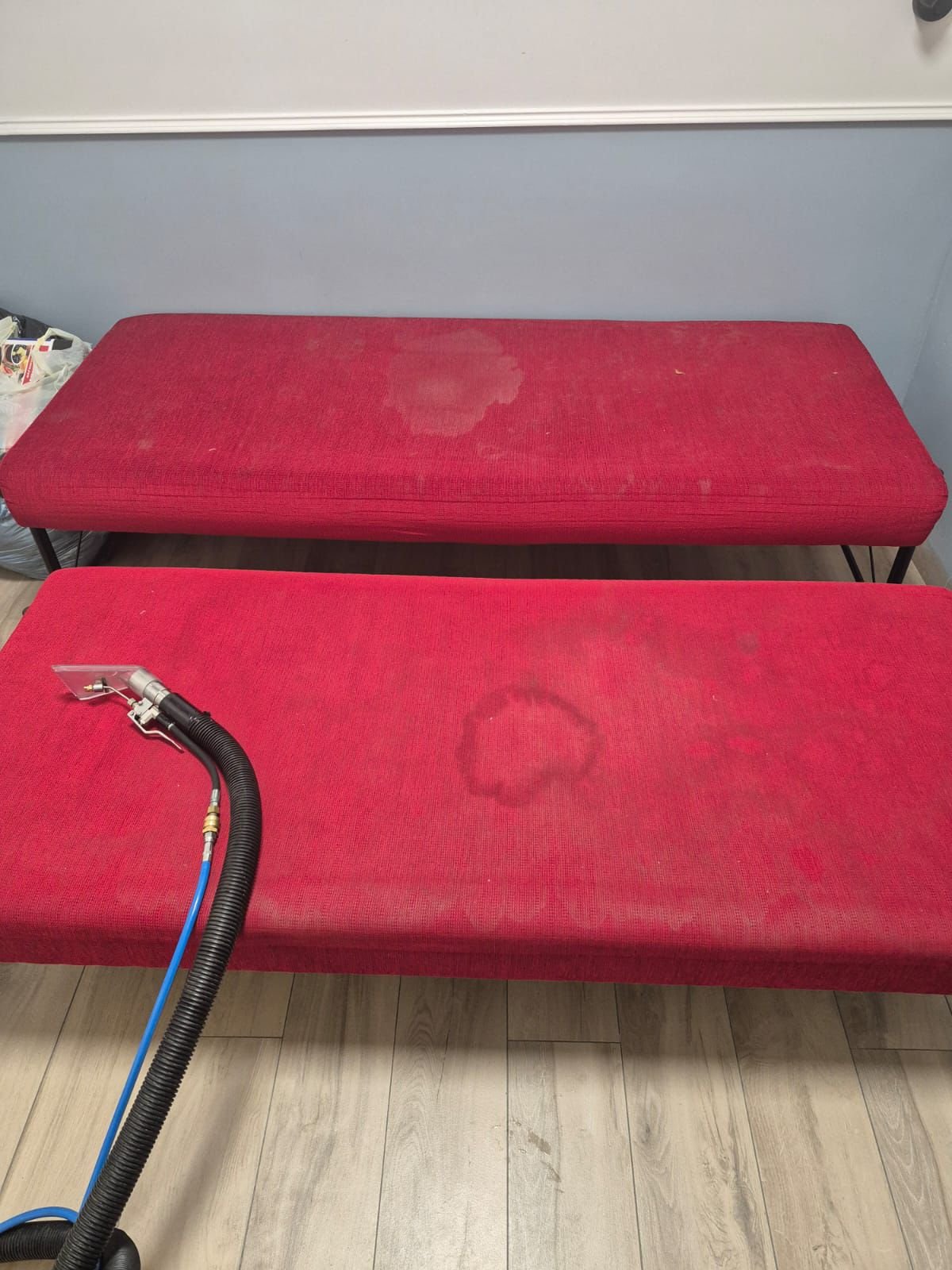 ניקוי וחיטוי ריפודים על ידי מכונה הזרקה יניקה פוליש וחומרים ייעודים לסוג הבד העבודה כוללת גם הזרקת מים נקיים עם חומרים שמעלים את הליכלוך כלפי מעלה ואז שאיבה על גבי הבד ךשאוב את כל הליכלוך אל המכונה